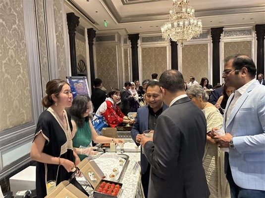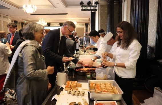 Guest enjoyed sushi, tempura, ramen, and other Japanese dishes prepared at the live cooking stations featuring the Consulate-General's Chef and Indian Goodwill Ambassador for Japanese Cuisine. Japanese alcoholic beverages Japanese strawberries produced in cooperation with the Japanese start-up and farmers in MH were also served. Additionally, Japanese government agencies, local governments, companies, and cultural organizations set up exhibition and information booths.